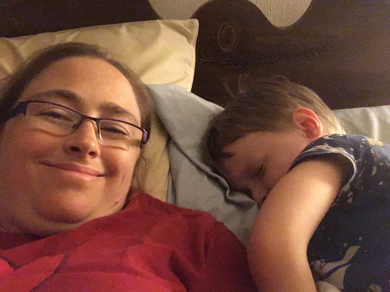 | Abishai said, "Mom, I'll pretend to sleep and you take a picture of me and you." Awww, he likes sleeping selfies! |